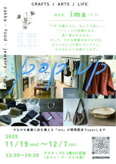 毎回人気の雑貨屋 ima (イマ)が、期間限定販売!