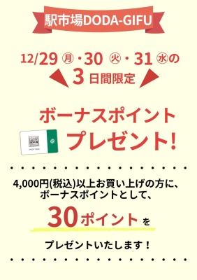 結んでたのしい!広げてたのしい!かわいい開運ふろ... NEW!!2025.12.28 SUNDAYsGOOD 2026/1/3(土)、1/4(日) 2日間限定!DODA ポイント2倍♪ NEW!!2025.12.24 駅市場DODA-GIFU ~企業と出会えるミニ企業説明会~ ジンチャレ!企業... 2025.12.16 ジンチャレ!ぎふJobステー... HELLO NEW SOCKS 2025.12.08 SUNDAYsGOOD 3日間限定!ボーナスポイントプレゼント! 2025.12.05 駅市場DODA-GIFU 【中島水産】ご予約承り中!年末のごちそうはDODAで! 2025.12.04 駅市場DODA-GIFU 期間限定・特別メニュー 2025.12.01 回転寿司 魚喜 カフェ・ド・クリエ福袋「ミニオンズハッピーバッグ2... 2025.11.15 カフェ・ド・クリエ ASTY岐阜×アクティブG「たまってうれしい!スタンプ... 2025年12月20日(土)~2026年01月05日(月) 2025.12.10 新春スピードおみくじ 2026年01月02日(金)~05日(月) NEW!!2025.12.25 アクティブG 福袋2026 販売! 2026年01月03日(土)~11日(日) NEW!!2025.12.26 【〜ながラー企画】出張しろく丸!絵本のよみきかせ... 2026年01月25日(日) NEW!!2025.12.24 2025.12.17 年末年始営業時間のご案内 2025.11.02 11月休館日のお知らせ 2025.09.04 9月休館日のお知らせ 2025.07.01 7月休館日のお知らせ 2025.06.07 【プレスリリース】「中島水産」6月11日(水)オープン! 生本まぐろ解体販売、スピードくじ、ポイントアップデー等開催! ■駅市場DODA-GIFU 10:00〜21:00 ■レストラン・ショップ 10:00~23:00 ※営業時間は変更となる場合がございます。 詳しくは各店舗へお問い合わせ下さい。 休館日 奇数月 第3火曜日 アクティブG〒500-8856岐阜市橋本町1丁目10−1