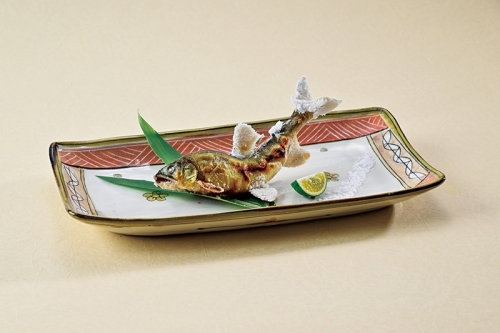 香ばしく焼き上げた鮎の塩焼きは、パリッとした皮の中にふっくら柔らかな身がぎっしり。すだちを搾ってさっぱりと食すのもおすすめ。