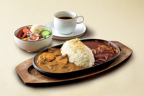 ショウガたっぷりの中辛カレーと、赤ワインを加えたコクのあるハヤシライスを合いがけした欲張りな一杯。サラダ、ドリンク付き。